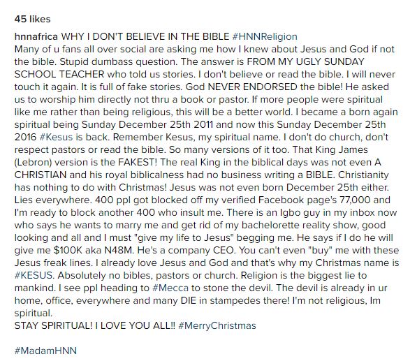 There is an Igbo guy in my inbox now who says he wants to marry me and get rid of my bachelorette reality show, good looking and all and I must "give my life to Jesus" begging me. He says if I do he will give me $100K aka N48M. He's a company CEO. You can't even "buy" me with these Jesus freak lines. I already love Jesus and God and that's why my Christmas name is #KESUS.