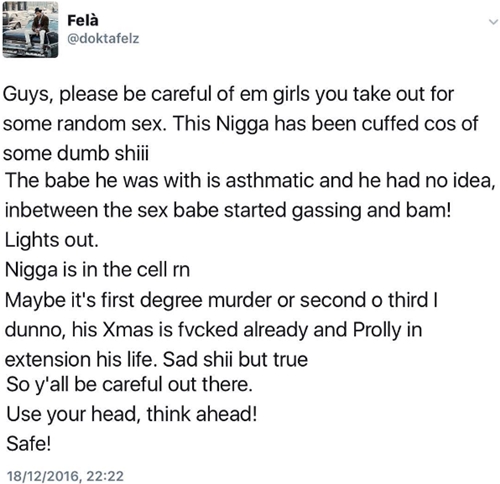 "Guys, please be careful of em girls you take out for some random sex. This Nigga has been cuffed cos of some dumb shiii.