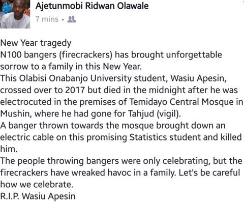 A very young man has been electrocuted by an electric cable cut by a firecracker thrown inside a mosque where he was observing crossover vigil.